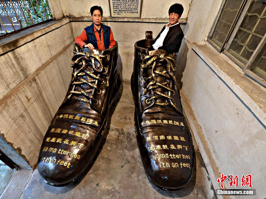 Fuzhou,10/05/2015(El Pueblo en Línea)-Zheng Chenggan, de 67 a?os, en la ciudad de Fuzhou ha realizado los zapatos de cobre más grandes del mundo. El apreciado par de zapatos tiene 1.3 metros de alto, 2,3 metros de largo y 0.8 metros de ancho. La fabulosa escultura pesa 1 tonelada.(Foto: CNS/Zhang Bin)