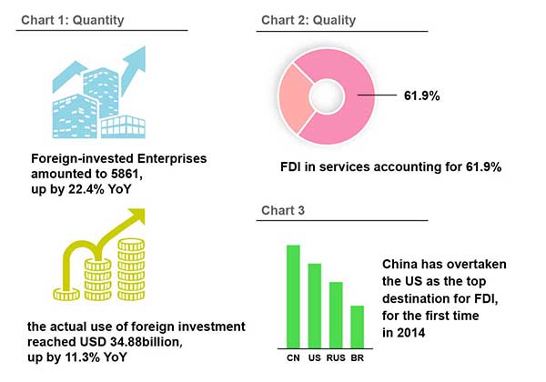 En el a?o 2014, el uso real de la inversión extranjera en toda China ascendió a 119,6 miles de millones de dólares, con un crecimiento de un 1,7 por ciento en comparación al mismo período del a?o 2013. También China disfrutó de una mayor afluencia de IED, por primera vez superando a los Estados Unidos, Rusia y Brasil.