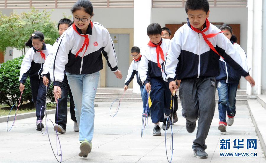 Los alumnos de una escuela primaria juegan al anillo de hierro en Suzhou, Jiangsu. (Foto: Wang Jianzhong)