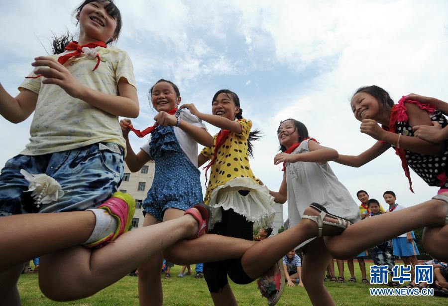 Los alumnos juegan a "tejer la cesta" en una clase de educación física en una escuela primaria de Shangyu, en Zhejiang. (Foto: Han Jian)