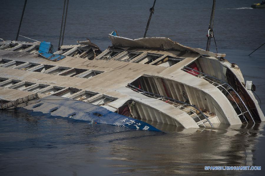 JIANLI, provincia de Hubei, 5 jun (Xinhua) -- Un lado del Estrella de Oriente, el barco volcado en el río Yangtse, fue reflotado hacia las 7:30 horas de hoy viernes, ya que los rescatistas trabajaron durante la noche para enderezarlo.
