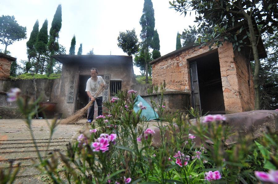 Xu Wenyi, de 57 a?os, limpia el patio de su casa cueva en el Condado de Xiangtan, provincia de Hunan. [Foto: Xinhua]
