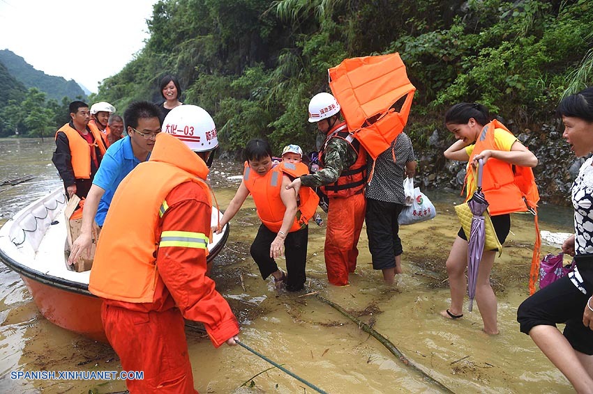 En Guilin, donde el paisaje pintoresco y el karst calizo atraen a visitantes de China y de otros países, los días de lluvias han elevado los niveles de agua, lo que motivó a las autoridades a detener el tránsito todos los buques en el río Lijiang.