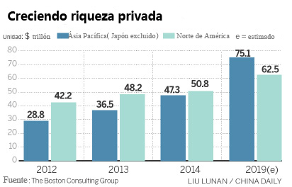 Por primera vez, Asia y Pacífico (excluido Japón) superó a Europa en cuanto a riqueza de sus habitantes, con un total de 47,3 billones de dólares en Asia en comparación con los 42,5 billones de dólares en Europa, según el informe. La consultoría prevé que la región de Asia y Pacífico sea probablemente la región más rica del mundo el a?o próximo con una riqueza estimada de 57 billones de dólares en capital privado, superando a EE.UU con 56 billones de dólares.