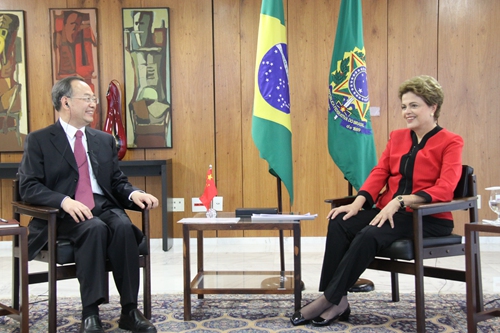 Pekín, 16/06/2015(El Pueblo en Línea)-La presidente de Brasil, Dilma Rousseff, hoy se reunió con la delegación de Diario del Pueblo encabezada por el presidente del Grupo, Yang Zhenwu en el Palacio Presidencial, y recibió una entrevista exclusiva. Durante el encuentro, Rousseff dijo que el estrecho contacto entre los líderes de Brasil y China ha promovido con fuerza las relaciones bilaterales. ¨El presidente de China, Xi Jinping, y yo hemos alcanzado un amplio consenso sobre el desarrollo de las relaciones bilaterales. China y Brasil tienen intereses comunes y compartimos los mismos sue?os¨.