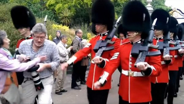 Londres,18/06/2015(El Pueblo en Línea)-La Guardia Real de Londres es uno de los cuerpos más respetados y quizá más rígidos del Reino Unido, sino que se lo digan al turista que por poco es embestido por un grupo de soldados que, sin inmutarse, continúan la marcha sin esquivarlo y llevándoselo por delante. La escena la captó la cámara de otro turista y el vídeo se ha convertido en viral en las redes sociales.