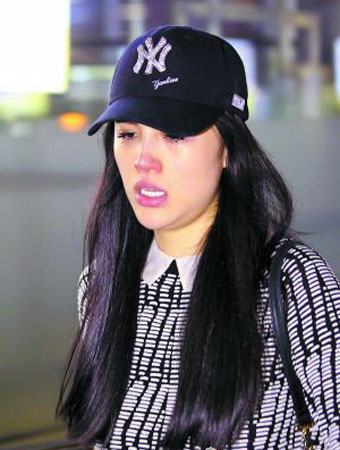Ge Tian, la ex esposa de Liu Xiang, llora a su llegada al aeropuerto de Pekín en la medianoche del jueves, después de que se hiciera público su divorcio del vallista retirado, el 25 de junio de 2015.