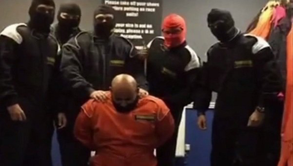 Uno de los trabajadores sostenía una percha para ropa a modo de cuchillo, y otro sujetaba al hombre arrodillado por los hombros. Entonces, uno de ellos grita "?Allahu Akbar!" ("Alá es grande" en árabe), una frase empleada a menudo por miembros del grupo EI antes de matar a sus rehenes.