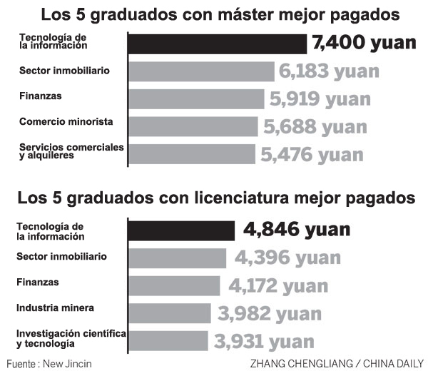 Los graduados con una licenciatura de ciencias de la información recibieron 4.846 yuanes (780 dólares) al mes, y los graduados con máster 7.400 yuanes al mes, seguido por los graduados en finanzas y estudios inmobiliarios.
