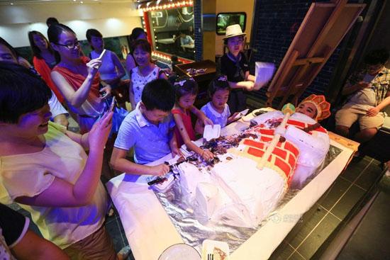 Los visitantes comen “carne” de Xuanzang, que en realidad es un pastel gigante.
