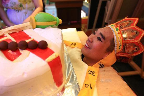 Un hombre vestido como Xuanzhang, miente debajo de una torta gigante.