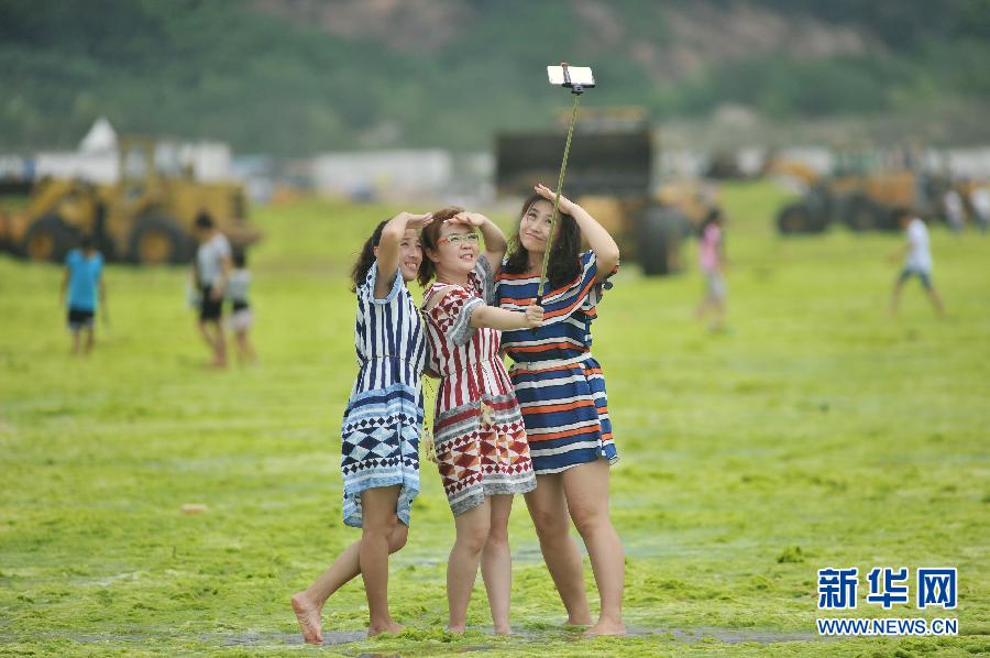 El 20 de julio, los turistas hicieron fotos en la playa cubierta por las algas marinas.