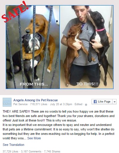 Luego de que la fotografía se volviera viral en las redes sociales, las mascotas consiguieron un hogar y recibieron un chequeo veterinario. "No hay palabras para demostrar lo felices que estamos de que estos dos mejores amigos estén seguros y juntos", dice una nueva publicación del refugio y agradece a quienes compartieron la publicación y ofrecieron su ayuda. La publicación la acompa?an con una fotografía del joven que les brindará un hogar.