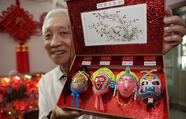 Fei muestra sus pinturas de máscara que representan a personajes de la novela clásica china Viaje hacia el Oeste.