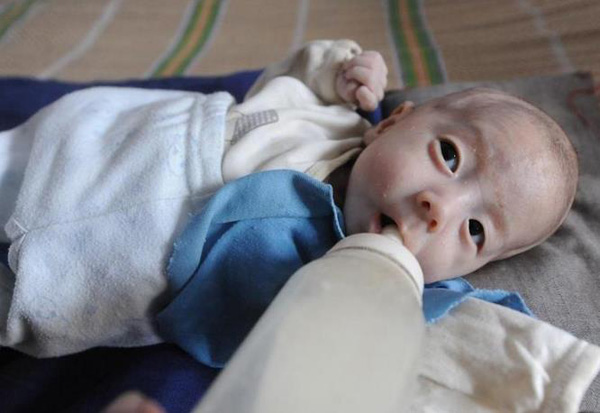 El ni?o, Guo Enze, de una familia pobre en la provincia de Shanxi, nació con el ano imperforado, por lo que su intestino queda bloqueado y no puede excretar adecuadamente. Cada día, come poco y duerme durante sólo siete horas. La enfermedad lo ha dejado muy delgado y arrugado.