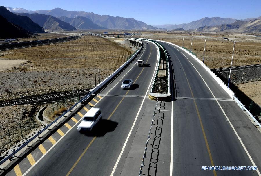 La fotografía muestra la primera carretera de Tibet, la carretera Lhasa-Gonggar, que tiene una longitud de 37,8 kilómetros y fue inaugurada en el a?o 2011.