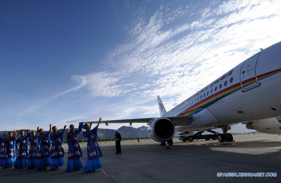 La fotografía tomada el 26 de julio de 2011 muestra la ceremonia del avión inugural de la Aerolinea Tibet en el aeropuerto Gonggar en Lhasa., la cual se trata de la primera compa?ía de aerolinea basada en Tibet