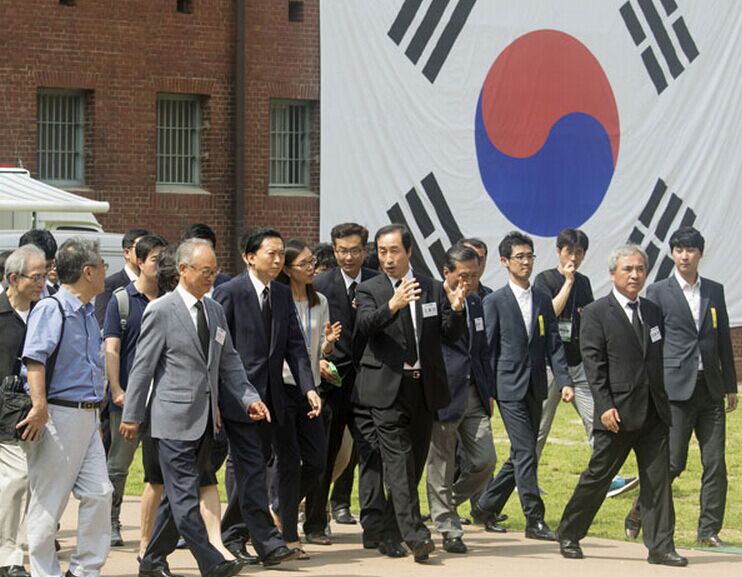 Ex primer ministro japonés Yukio Hatoyama (primera fila, tercero a la izquierda) visita la Prisión de Seodaemun en Seúl, Corea del Sur, 12 de agosto de 2015.