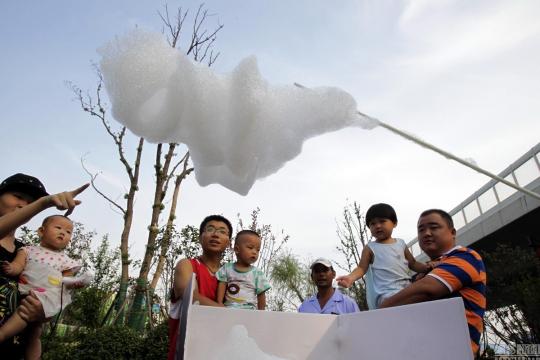 Zhengzhou, 18/08/2015(El Pueblo en Línea)-Un hombre crea "nubes" que hace flotar en el cielo de la ciudad de Zhengzhou, provincia de Henan, el 16 de agosto de 2015. Las "nubes" en forma de estrellas, corazones y esponjas atrajeron mucha atención.