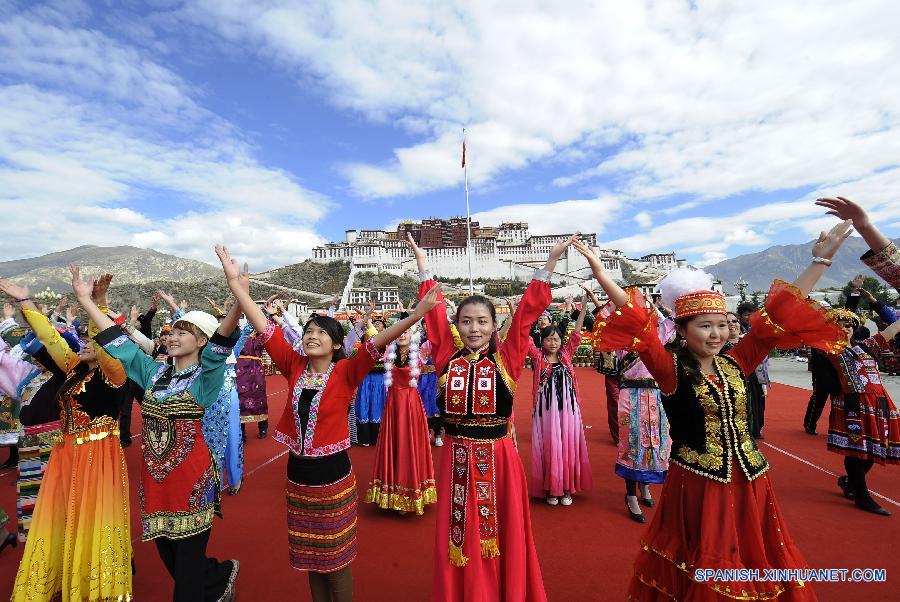 La foto muestra a un grupo de jóvenes de diferentes étnias bailando en la plaza del Palacio Potala para celebrar el 50 aniversario del establecimiento dela Región Autónoma deTibet.