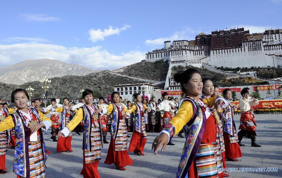 La foto mestra a un grupo de chicas tibetanas bailando en la plaza del Palacio de Potala.