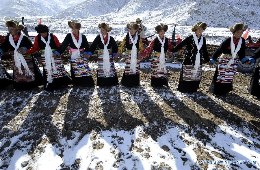 La foto muestra a un grupo de campesinos tibetanos bailando durante una ceremonia tradicional.
