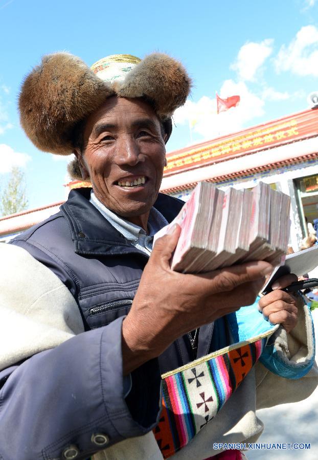 La foto muestra a un campesino tibetano que acabó de recibir crédito bancario. Este a?o marca el 50 aniversario del establecimiento de la Región Autónoma de Tibet.