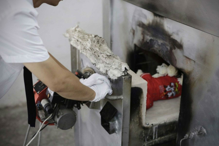 Un trabajador de la empresa funeraria para mascotas incinera a un perro en Shanghai, el 29 de agosto de 2015. [Foto/China.com]