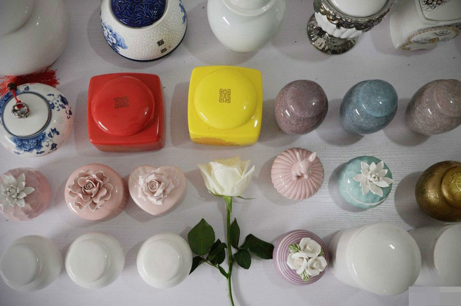 La foto muestra varios tipos de urnas para mascotas incineradas. [Foto/China.com]