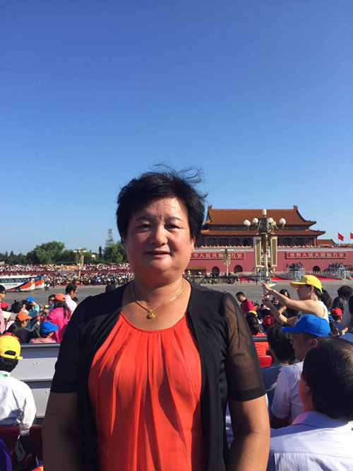 Pekín, 03/09/2015 (Pueblo en Línea)-A las 8:30 de la ma?ana del 3 de septiempre, Li Yuanmin, una ciudadana proveniente del pueblo de Gainingmai de la Región Autónoma Uygur de Xinjiang se sienta al lado oeste de la Plaza Tian′anmen. Ella participa en la actividad de conmemoración del Día de la Victoria como una de las representante de las mujeres que son vanguardias nacionales.
