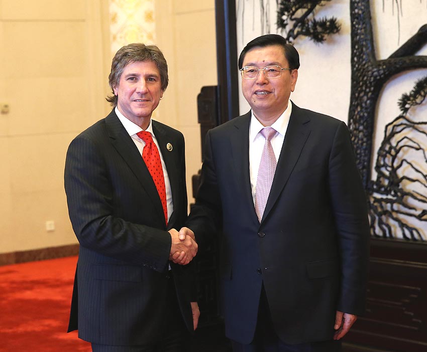 Zhang, presidente del Comité Permanente de la Asamblea Popular Nacional (APN), agradeció a Boudou, vicepresidente argentino y jefe del Senado del país sudamericano, por asistir a la conmemoración del 70° aniversario del final de la Segunda Guerra Mundial.