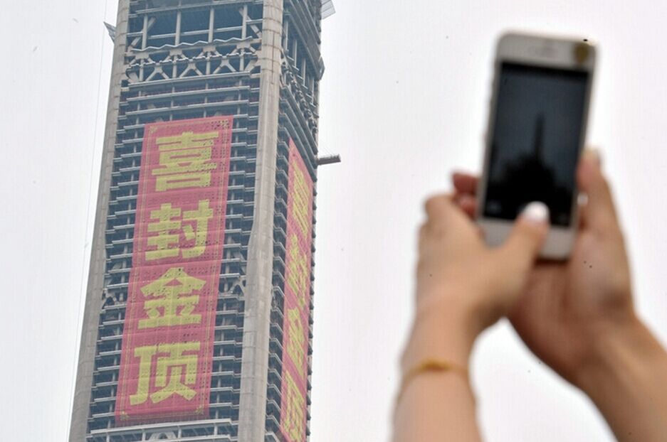 La foto muestra la gigantesca Torre de Tianjin (117 pisos). Con una estructura central de 596,5 metros, se convierte en el segundo edificio más alto del mundo, después del Burj Khalifa de Dubai, en Emiratos árabes. La construcción de la torre, que ya tiene una superficie de 847.000 metros cuadrados, se puso en marcha hace siete a?os.