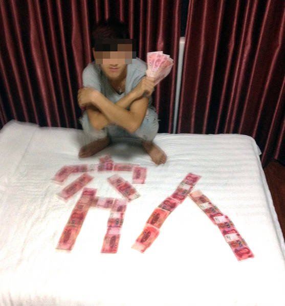 El ladrón, de apellido Tang, posa con los billetes que robó en un hotel. Los billetes forman los caracteres chinos “qiong ren”, que significa “hombre pobre”. [Foto/qq.com]
