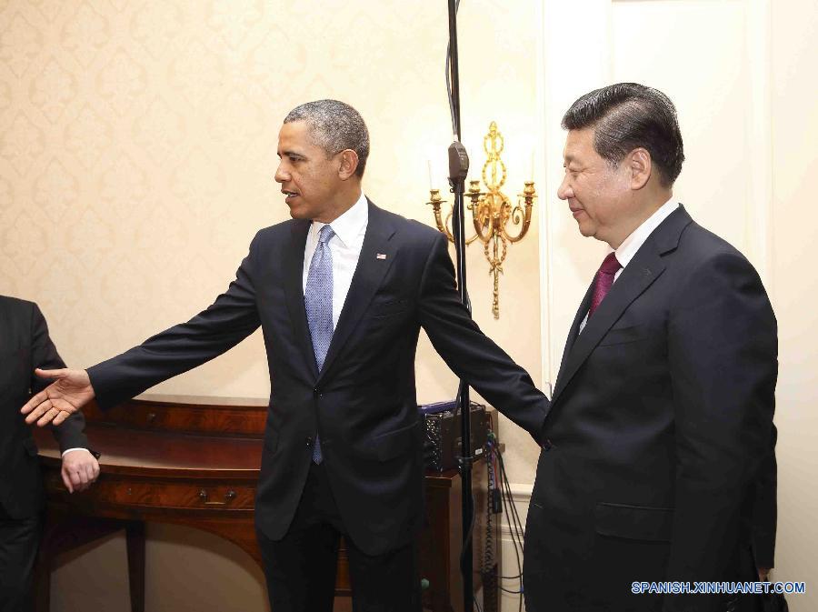 El presidente chino Xi Jinping (D) se reunió con el presidente estadounidense Barack Obama en la Haya, Holanda, el 24 de marzo de 2014 en el marco de el cumbre de seguridad nuclear.