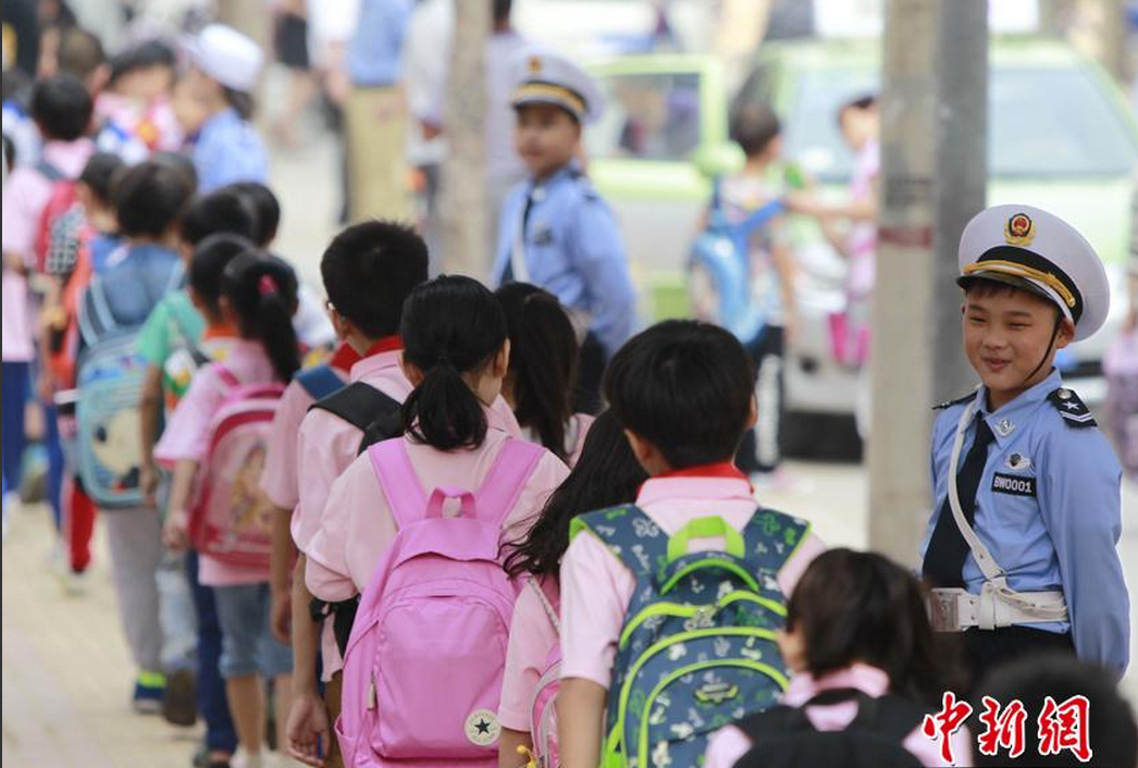 Zhengzhou, 23/09/2015(El Pueblo en Línea)- Varios estudiantes, caracterizados como policías de tránsito, guían a sus compa?eros de primaria en Zhengzhou, provincia de Henan.