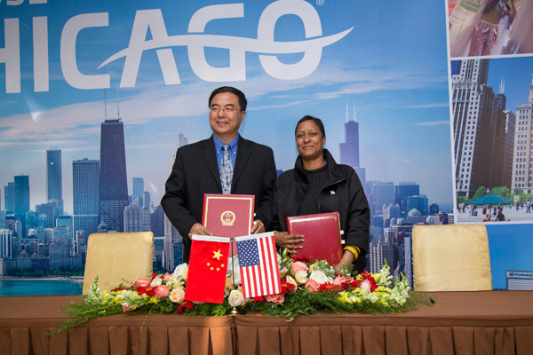 Zhao Haisheng (izquierda), vice general director del Departamento de Relaciones Internacionales del Ministerio de Cultura de China y Melissa Cherry, vicepresidente de Turismo Cultural y Barrios de Chicago firman en China un memorandum de entendimiento para la cooperación cultural. Mayo, 2015. [Foto: China Daily]