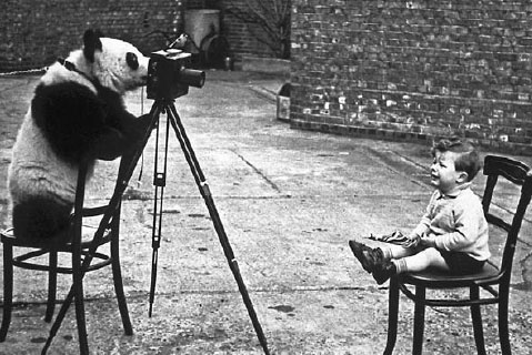 El panda Ming se pone detrás de la cámara para el fotógrafo Bert Hardy en 1939, en zoológico de Londres. En la silla está sentado el hijo de Hardy Mike. Imagen de Getty