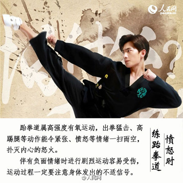 Pekín, 06/11/2015(El Pueblo en Línea)-Practicar Taekwondo genera una una alta actividad cardíaca que puede aliviar el nerviosismo y liberar emociones como la ira. Pero usted debe tener cuidado para evitar golpes y heridas. (Foto: Diario del Pueblo en línea)