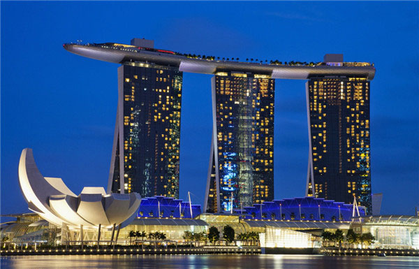 9. Además de hacer turismo, compras y comer, los turistas también pueden disfrutar de los juegos de azar en un ambiente espectacular, como el casino Marina Bay, que se encuentra justo delante de la estructura icónica de la ciudad, el hotel Marina Bay Sands, con forma de barco sobre tres torres.