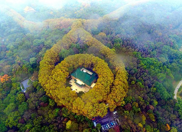 El "Palacio May-ling", como lo llaman los lugare?os, se encuentra en la cima de la colina Xiaohong, en ciudad de Nanjing, provincia de Jiangsu. Las fotos aéreas muestran que la carretera con árboles de color amarillo en el camino hacia la residencia parece un collar mientras que el techo del palacio se parece a una esmeralda.