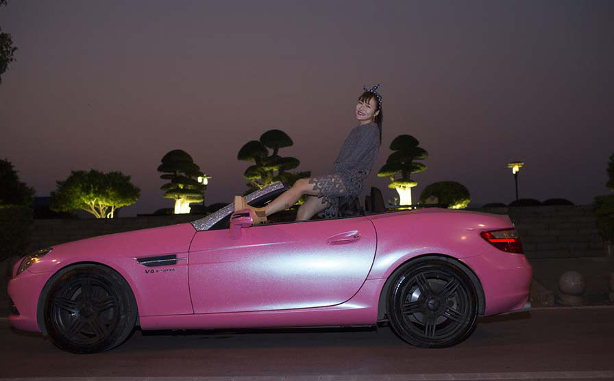 Yang Shili posa en su coche rosado. Changsha, Hunan, 14 de octubre de 2015. [Foto: IC]