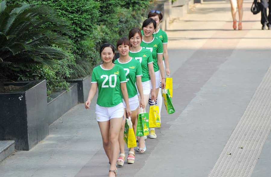 En Chengdu, Sichuan,cinco mujeres de una empresa de alimentos se visten como animadoras de fútbol para distribuir comidas para llevar. 17 de junio de 2014. [Foto: IC]