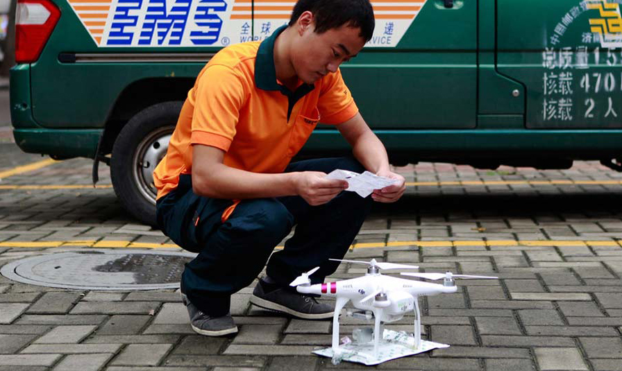 Un hombre entrega paquetes utilizando un drone en Jinan, provincia de Shandong, 02 de septiembre de 2015.