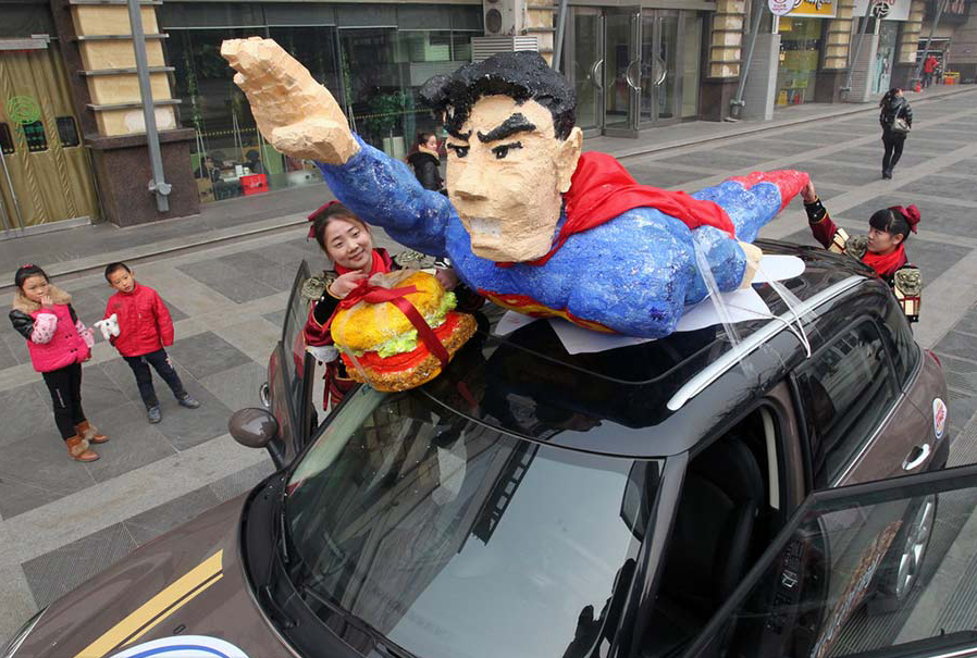 Camareras vestidas como guerreras de terracota entregan hamburguesas a bordo de un vehículo Superman. Xi'an, provincia de Shaanxi. 21 de diciembre de 2013. [Foto: IC]