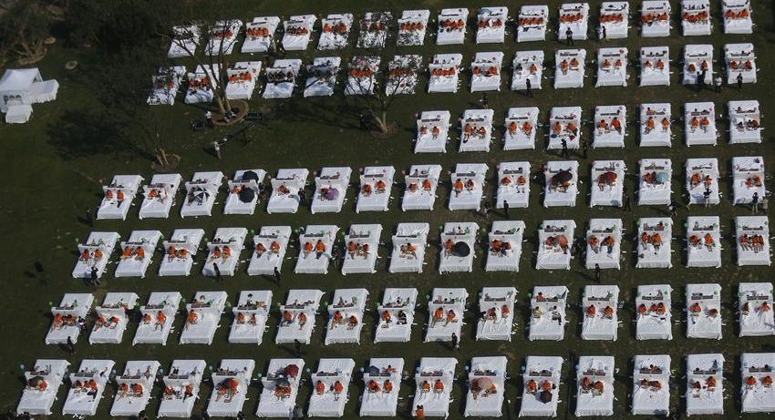 418 personas se reunieron en el jardín del hotelSheraton Langfang, al borde del río Chaobai, para establecer un nuevo récord Guinness, la mayor cantidad de personas consumiendo el dsayuno en la cama.