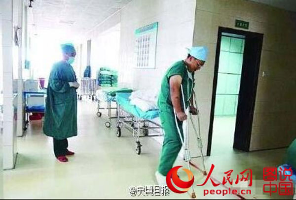 Después de 4 horas de pie y una vez terminada la operación, Leng Yong, “el buen doctor de Xiaogan”, regresa a su casa ayudado por unas muletas. (Foto: chinapic.people.com.cn)