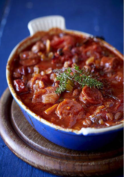 Cazuela de alubias con chorizo. Cassoulet, el clásico plato francés que recibe su nombre de la olla de barro que se cuece al horno, es un guiso rico, cocinado a fuego lento que contiene carne (generalmente chorizo, pato y cordero) y el ingrediente esencial - alubias blancas. [Foto/IC]