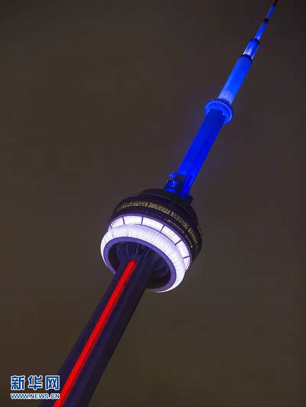 Torre de CN en Toronto, Canadá, iluminada con los colores de la bandera francesa como una se?al de luto por las víctimas de los ataques terroristas de París.