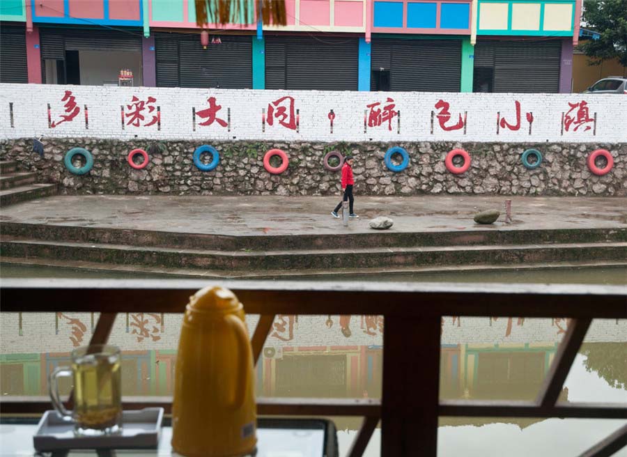 Las letras del muro dicen: “Disfruta de Datong, un pueblo que te hipnotizará”.