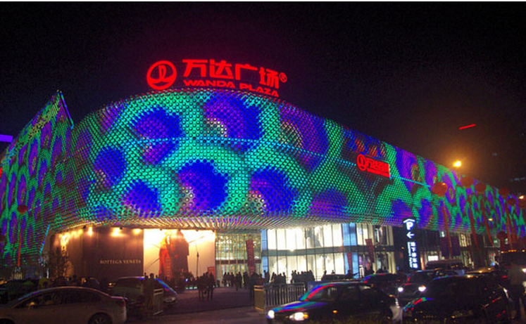 Vista nocturna de la Plaza Wanda en Wuhan, provincia de Hubei.